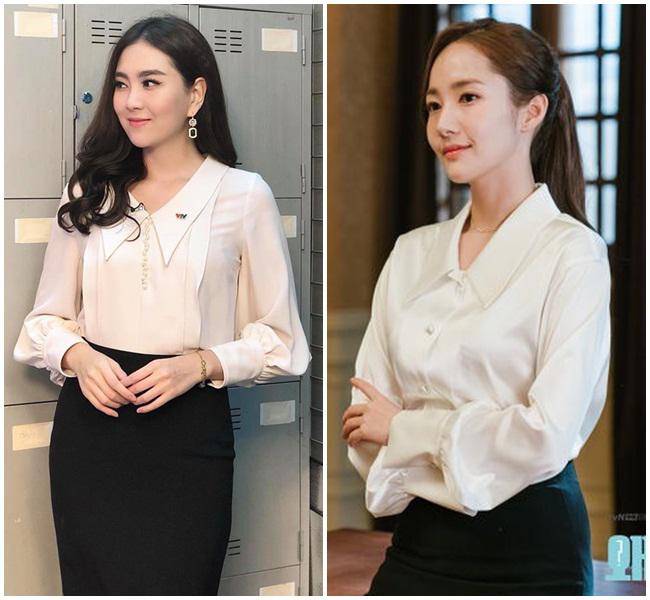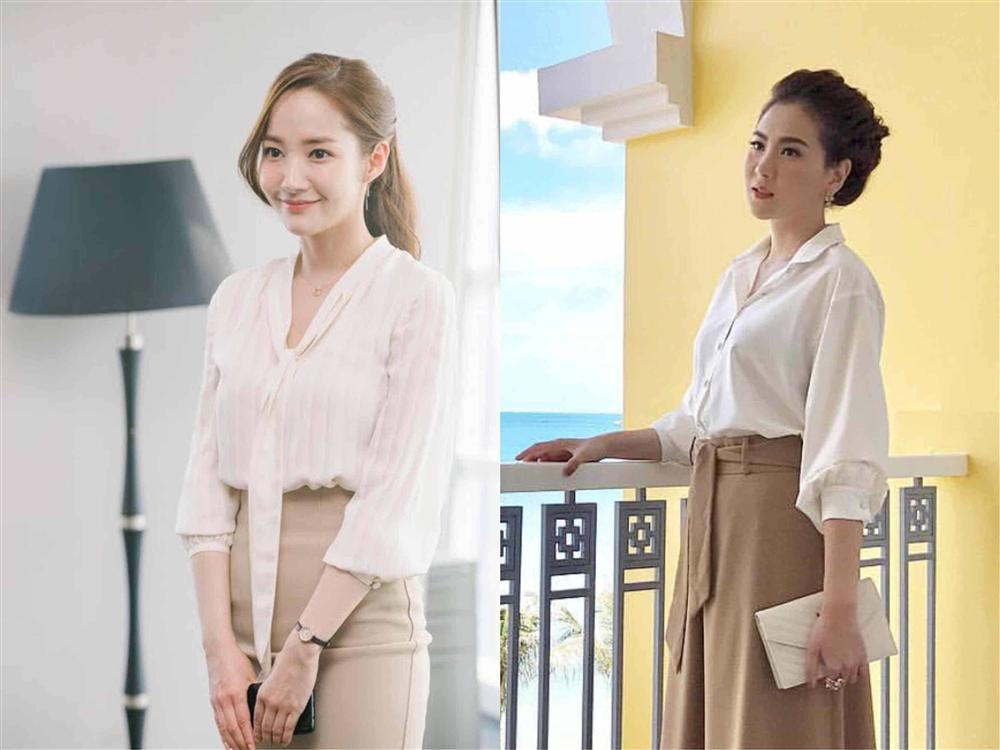 Sơ mi thắt nơ là mẫu áo gắn liền với Thư Ký Kim trong suốt bộ phim và cô nàng Mai Ngọc cũng không thể bỏ qua item hot này.