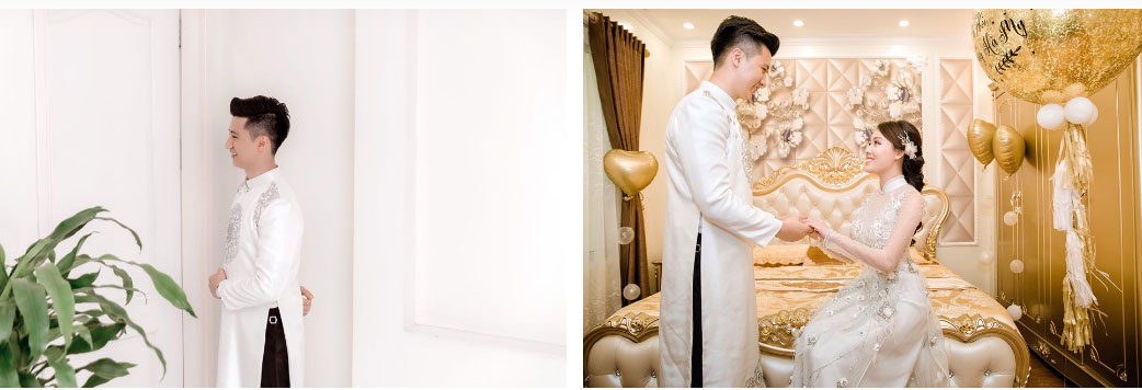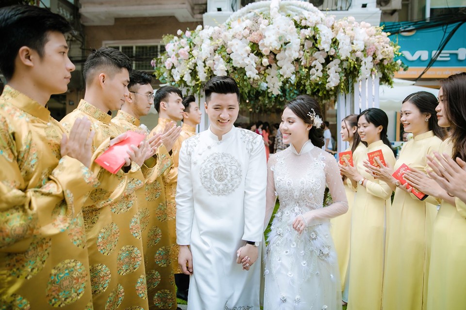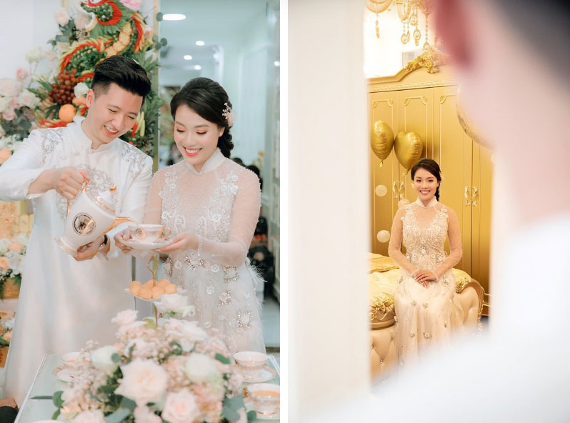 Ngoài việc hoa cưới lộng lẫy, cô dâu cũng tiết lộ hai bộ áo dài được thiết kế riêng mất nhiều ngày vì đính kết tốn thời gian.