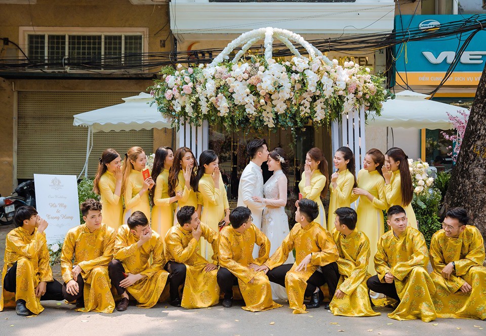 Cô dâu chú rể chụp hình với dàn bê tráp.