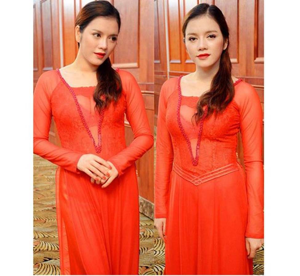 Lý Nhã Kỳ cũng từng gây sóng dư luận với áo dài màu cam, mỏng dính lộ nội y rõ mồn một. Dù nội y đã được chọn tiệp màu với áo dài nhưng chi tiết ren xuyên thấu trở thành vô duyên, phá bỏ vẻ đẹp thanh lịch vốn có của trang phục. Thay vào đó là sự khoe thân quá đà.