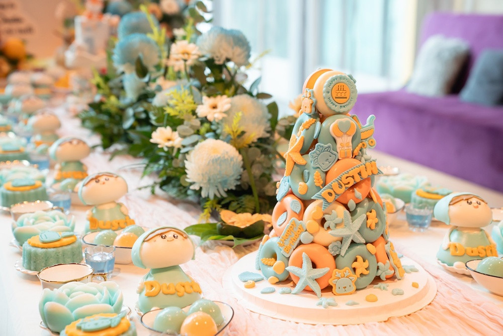 Theo đó, bữa tiệc thôi nôi diễn ra ấm cúng với sự góp mặt của người thân và bạn bè của cặp đôi. Tiệc sinh nhật 1 tuổi của con trai diễn viên Quang Minh được trang trí với tông màu cam và xanh dương chủ đạo. Bánh sinh nhật, hoa quả được sắp xếp đẹp mắt, đầu tư và tỉ mỉ.
