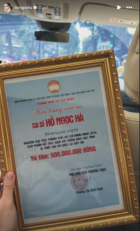 Mới nhất, Hồ Ngọc Hà cập nhật trên trang cá nhân hình ảnh cô ủng hộ đồng bào chịu ảnh hưởng bởi bão lũ số tiền 500 triệu đồng. Nữ ca sĩ quyên góp số tiền này thông qua Ban thường trực ủy ban Mặt trận Tổ quốc Việt Nam - Ban vận động cứu trợ thành phố Hồ Chí Minh.