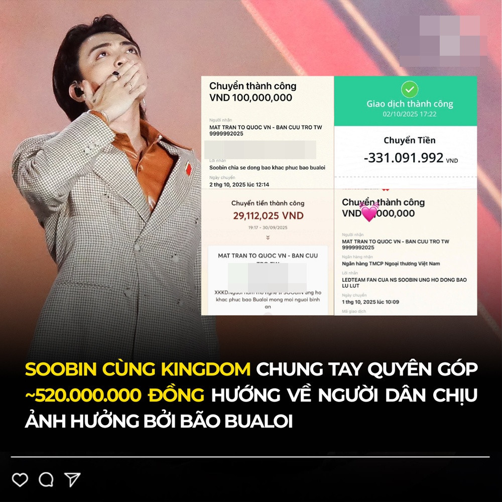 Soobin Hoàng Sơn cũng có cập nhật mới. Nam ca sĩ trước đó đã ủng hộ 100 triệu đồng cho bà con vùng bão lũ. Anh cho biết FC Kingdom và fan của anh đã chung tay quyên góp thêm, tổng cộng số tiền lên đến gần 520 triệu đồng.