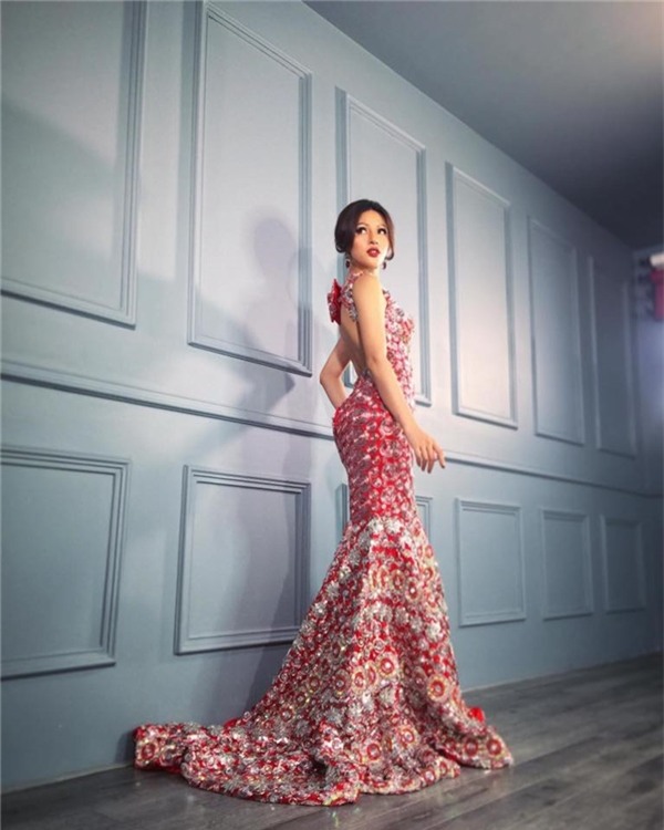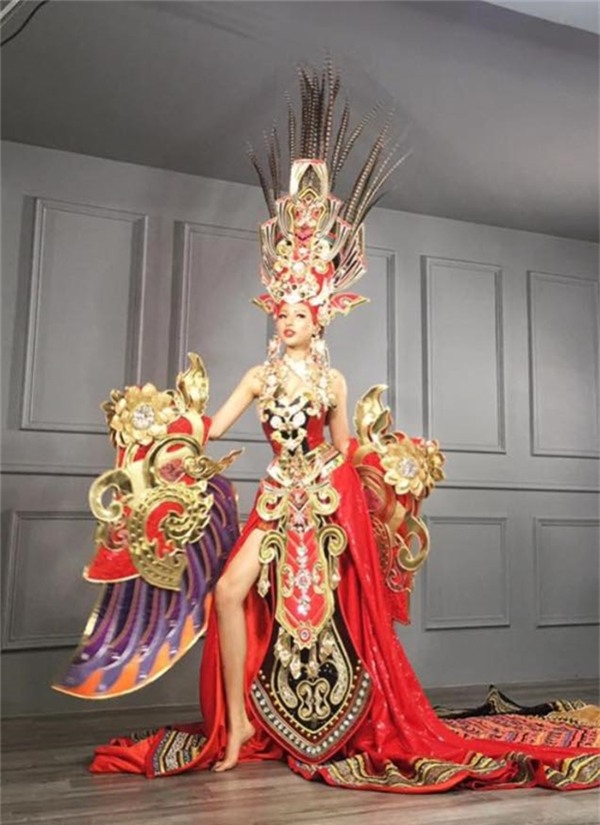 Trang phục truyền thống, dạ hội của Khả Trang lấy hai tông màu vàng, đỏ nổi bật làm chủ đạo.