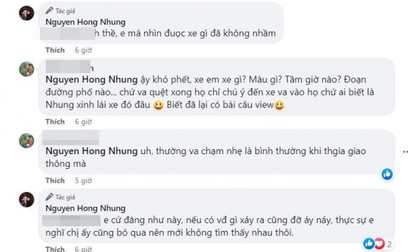 Chị Hồng Nhung chia sẻ thêm: 'Đen ở chỗ, mình hỏi thằng cu Minh có phải xe kia mẹ quệt không, nó bảo đúng rồi, lao đuổi theo hoá ra không phải, rồi người ta nghĩ mình chạy thì toi'. Chính vì vậy, vợ Xuân Bắc mới đăng lên facebook. Tuy nhiên, có người khuyên cô nên miêu tả cẩn thận hơn đi xe gì đường nào thì người bị va quệt vào gương mới biết được. Dù vậy, cách hành xử của vợ Xuân Bắc vẫn được khen ngợi.