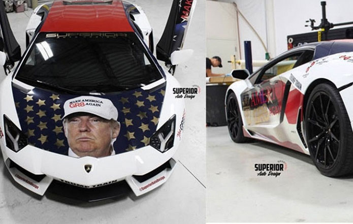 Đây là chiếc siêu xe Lamborghini Aventador Donald Trump được ra mắt vào tháng 5/2016 của một người hâm mộ tỷ phú này. Chiếc xe được tạo ra với mục đích ủng hộ cho ông Trump thắng cử vào vị trí Tổng thống Mỹ và kết thúc vào ngày 8/11 vừa qua.
