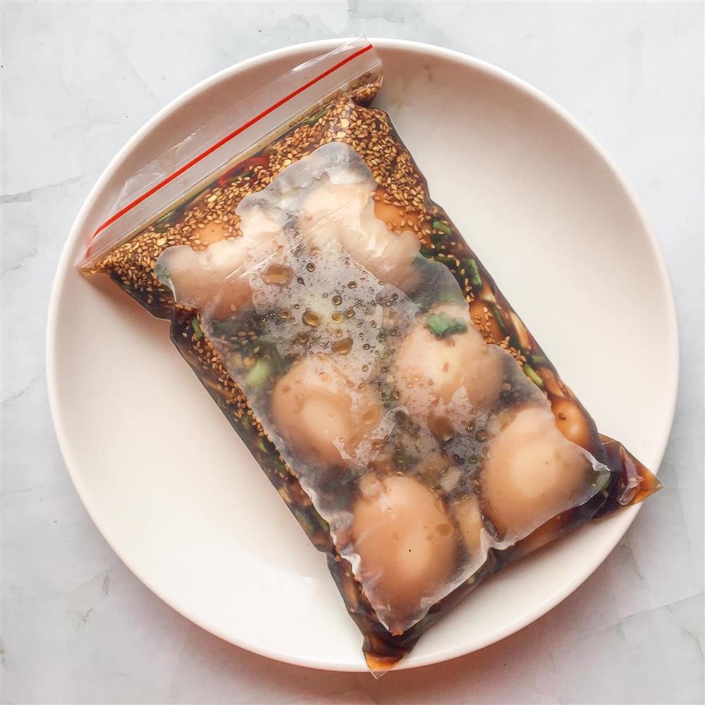 Sử dụng túi zip sẽ giúp trứng ngấm đều nước tương mà không phải lật trở mặt trứng. Trứng ngâm nước tương bảo quản trong tủ lạnh và sử dụng trong vòng 1 tuần.
