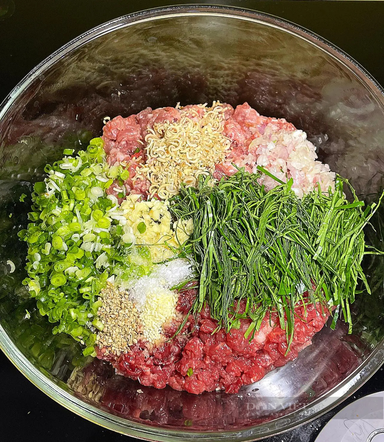 Thịt bò và thịt lợn xay nhỏ Hành lá, hành củ, củ sả thái nhỏ