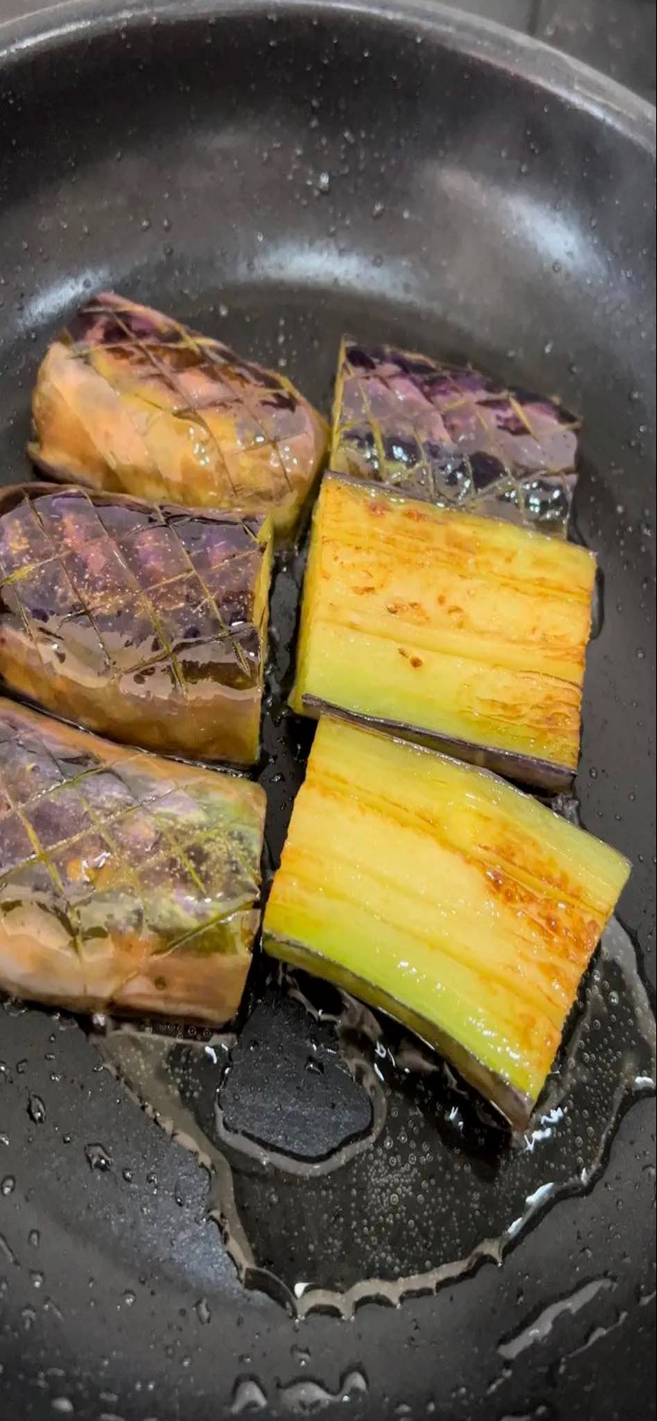 - Cà tím cắt khúc đều nhau, bổ đôi, khía để ngấm gia vị.