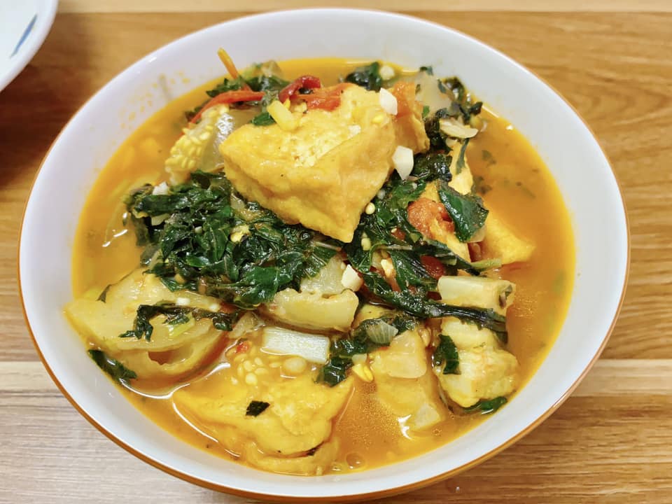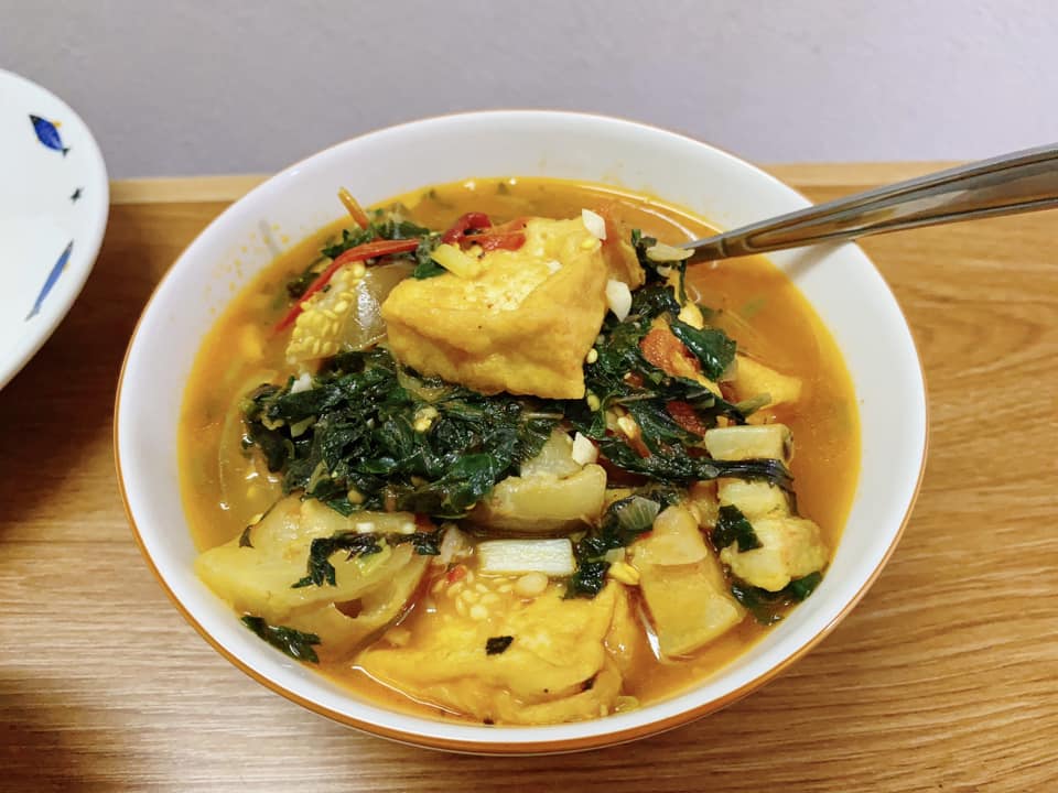 Thành phẩm món ăn có nhiều màu sắc rất bắt mắt: màu vàng óng của đậu và nghệ, màu đỏ của cà chua, màu xanh từ các loại rau thơm, màu nâu xám của cà và thịt...
