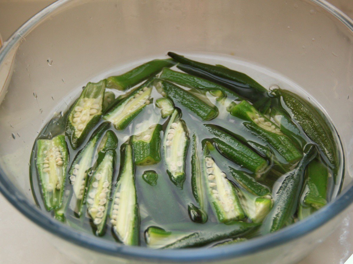 3. Đậu bắp đã luộc chín vớt ra cho vào bát nước lạnh. Để khoảng 5 phút thì vớt ra rổ cho ráo nước. Lưu ý, đậu bắp sẽ có 1 lượng chất nhầy nhớt không nhỏ. Đây là dinh dưỡng của loại rau này vì thế bạn đừng cố gắng rửa sạch đi nhé.