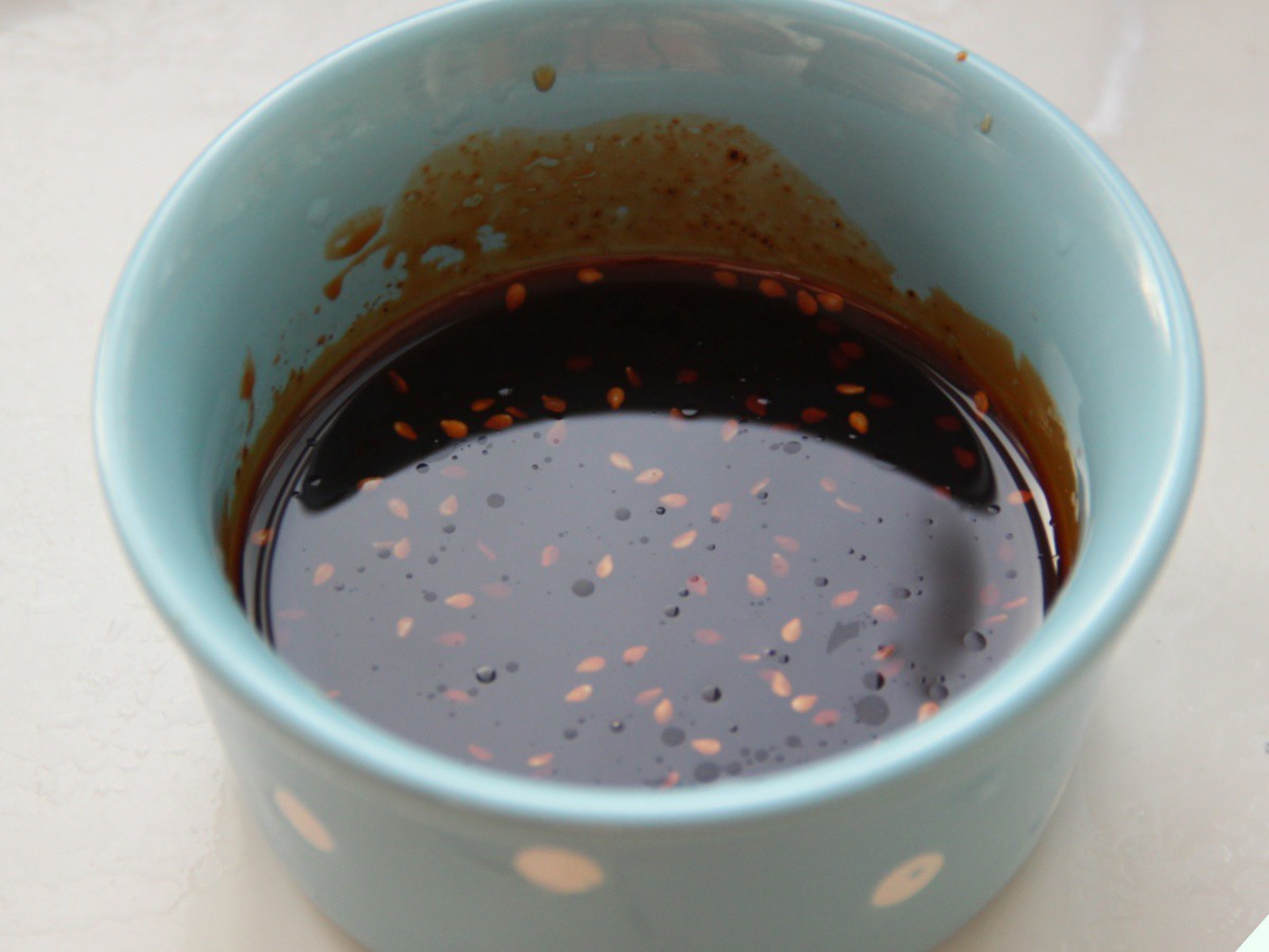 5. Phần sốt trộn là linh hồn của món ăn này. Đầu tiên, bạn hãy cho vào bát 2 thìa nước tương nhạt, 1 thìa nước tương đậm cùng 2 thìa dầu ớt. Để sốt thơm ngon hơn, hãy bổ sung thêm ½ thìa cà phê đường, 1 thìa hạt nêm và 1 thìa giấm ăn.