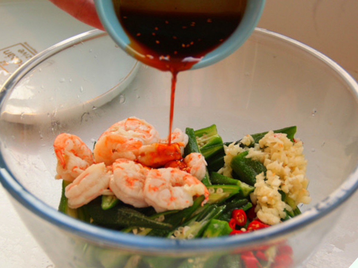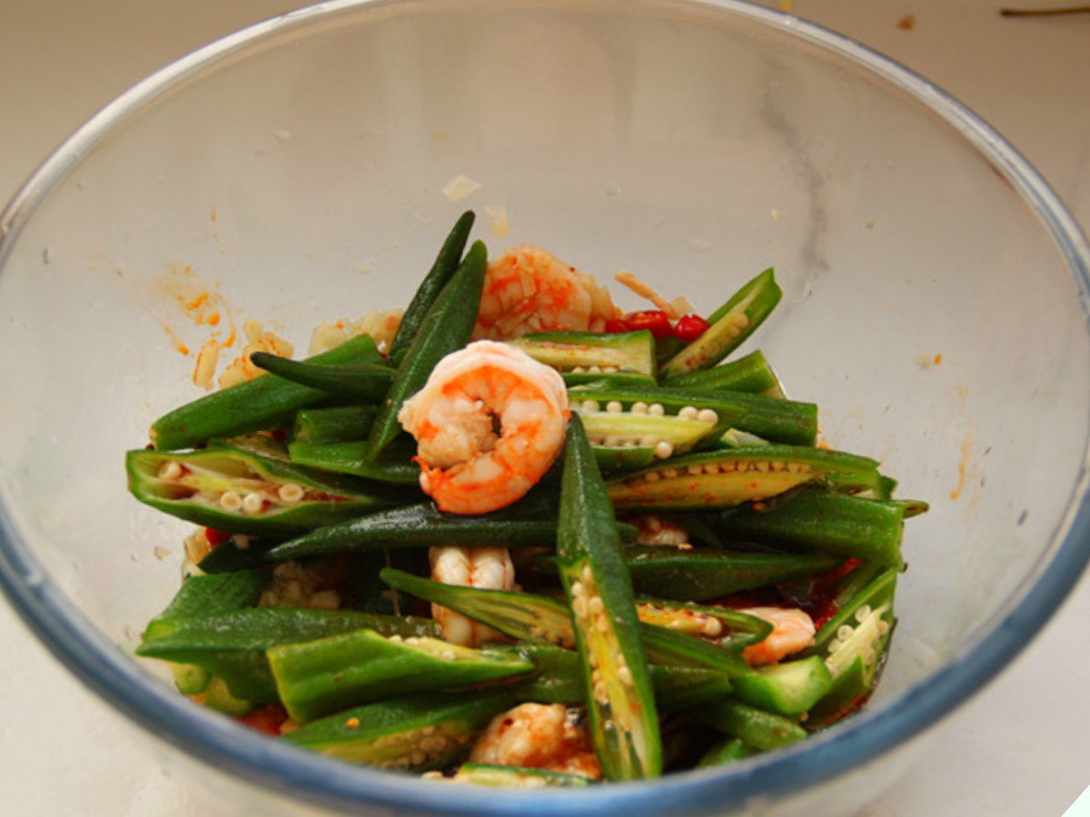 Ướp khoảng chừng 5 phút là có thể mang đi thưởng thức. Bằng cách này, tôm và đậu bắp sẽ ngấm đều gia vị hơn.
