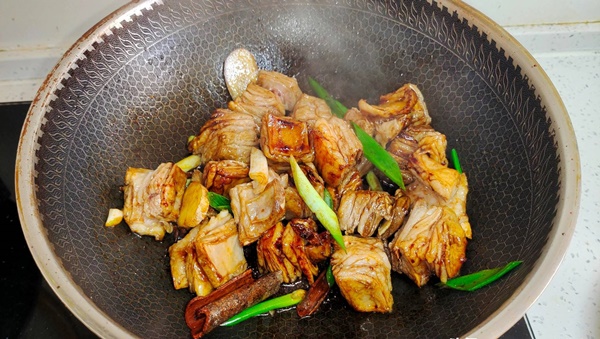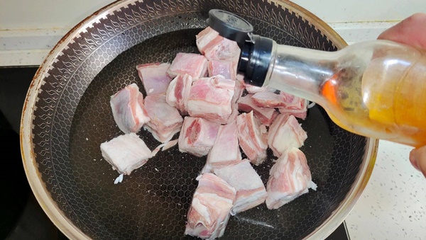 - Bắc nồi lên bếp, đun khô rồi cho 1 ít dầu lạnh vào, cho 1 thêm 1 thìa đường trắng và xào từ từ trên lửa nhỏ cho đến khi đường tan và chuyển sang màu đỏ hạt dẻ và nổi nhiều bọt thì thêm sườn cừu vào và đảo đều.