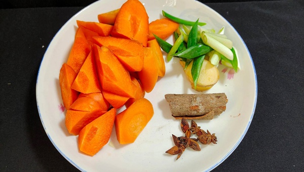 - Cà rốt gọt vỏ, cắt khối vuông. Hành lá cắt khúc, gừng cắt lát mỏng. Chuẩn bị 1 ít hoa hồi và quế.