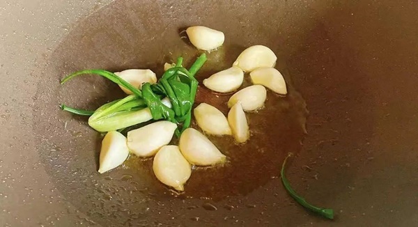 Bước 3: Đổ một ít dầu ăn vào nồi, đun nóng. Sau đó cho các tép tỏi và hành lá buộc túm vào xào sơ đến khi tỏi chuyển sang màu vàng nhạt.