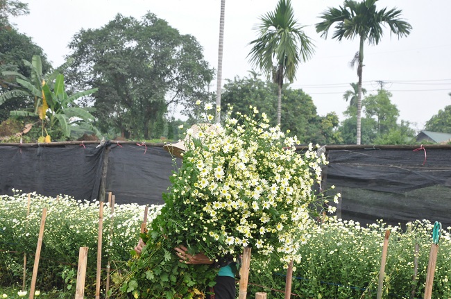 Có mặt tại Tây Tựu từ lúc sáng sớm tinh mơ vào những ngày này, không khó để bặt gặp những người nông dân đang hối hả cắt và vận chuyển những bó cúc họa mi “khổng lồ”.