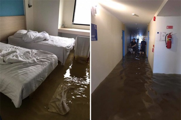 Có lẽ, đây là chùm ảnh mà chẳng khách thuê phòng nào muốn nhìn thấy khi phải nghỉ trọ tại một khách sạn tại Sakon Nakhon. Nước bẩn ngập đến đầu gối ở hành lang khách sạn và theo vào cả trong phòng.