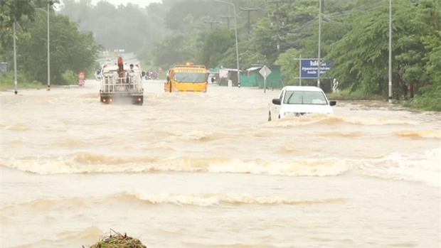 Dòng nước che lấp hết mặt đường tại tỉnh Kalasin đã gây khó khăn cho việc di chuyển các phương tiện.