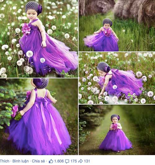 Những ngày vừa qua, những bức ảnh đẹp như cổ tích chụp một bé gái trong bộ váy tím chạy nhảy trên đồng cỏ xanh được chia sẻ trên mạng xã hội đang thu hút nhiều sự chú ý. Khi nhìn vào loạt ảnh này, hẳn nhiều người sẽ cho rằng đây là những bức ảnh được chụp bởi nhiếp ảnh gia nước ngoài. Hoặc chí ít, cô bé "nhân vật chính" trong bức ảnh cũng có chút gì đó "lai Tây".