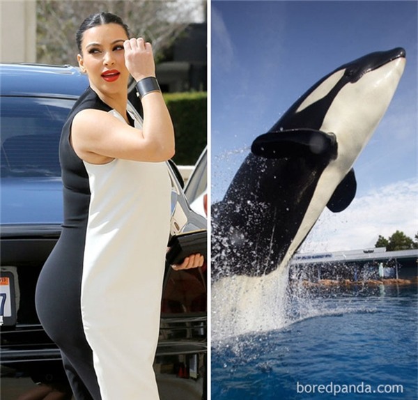 Bộ trang phục với hai màu trắng, đen tương phản của Kim lại có nét tương đồng với cô cá heo xiếc khổng lồ.