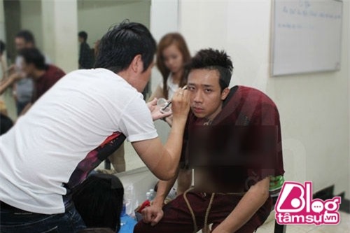 Được nhân viên make up ở hậu trường, Hoài Linh mệt mỏi không cất nổi nụ cười nhưng vẫn cố tạo dáng xì tin trước ống kính