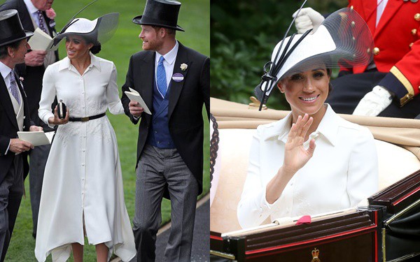 Meghan xuất hiện xinh đẹp, duyên dáng trong bộ váy màu trắng thanh lịch của nhà thiết kế Givenchy. Nàng dâu mới của hoàng gia Anhlựa chọn chiếc mũ có hai màu sắc chủ đạo là đen và trắng với thiết kệ độc đáo, hài hòa với bộ trang phục.