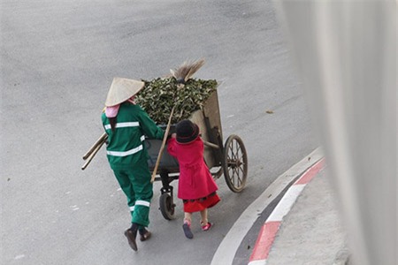 Bộ ảnh ghi lại cảnh hai mẹ con cô lao công đang đi trên đường cùng nhau. Bé gái được ăn mặc khá tươm tất với áo khoác đỏ ấm áp bên cạnh người mẹ trong bộ đồng phục làm việc của mình. Điều khiến bộ ảnh gây được xúc động cho người xem chính là hình ảnh bé gái nhỏ đẩy xe rác và cầm chổi phụ mẹ quét rác. Dáng vóc nhỏ bé, gương mặt tươi tỉnh và nét rạng rỡ trong ánh mắt bé dành cho mẹ đã nói lên được rất nhiều tình cảm mà bé dành cho mẹ của mình.
