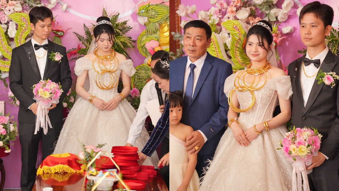 Trong ngày cưới, cô dâu đeo tổng cộng 15 cây vàng trên người. Trong đó, kiềng vàng trên cổ được xếp thành 3 tầng khiến người nhìn choáng váng. Cổ tay, ngón tay cô dâu cũng đeo ngập nhẫn vàng, vòng vàng.