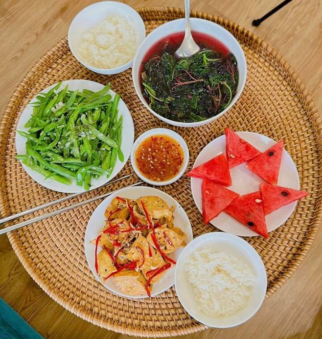 Dù ít tiền, thực đơn của chị Giang khá phong phú, thay đổi mỗi bữa, hôm thì thịt nhồi mướp đắng, hôm thì trứng chiên, hôm thì tép rang, đậu phụ sốt cà, trứng cút rim mắm tỏi. Rau có muống, bí đỏ, lặc lè, mướp, giá, cải thảo...