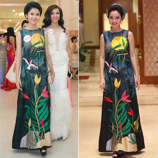 Huỳnh Thị Thùy Dung - Tân Hoa khôi Ngoại Thương 2016 đang là ứng viên tiềm năng cho ngôi vị Hoa hậu Việt Nam 2016 này. Tương tự như Mỹ Linh, Thùy Dung chọn cho mình một trang phục vô cùng khác biệt và nổi bật. Đó là chiếc đầm suông mang hình họa dân gian của NTK Thủy Nguyễn. Với bộ cánh này, Thùy Dung vô tình "đụng hàng" với Hoa hậu Jennifer Phạm.