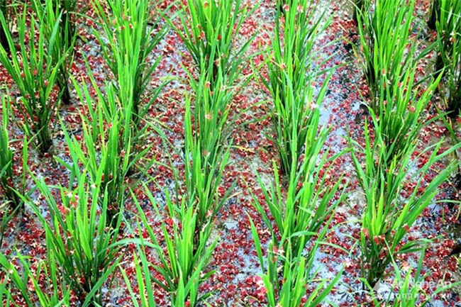 Những bông hoa lộc vừng rụng xuống khiến đám ruộng trông như một tấm thảm đỏ. |