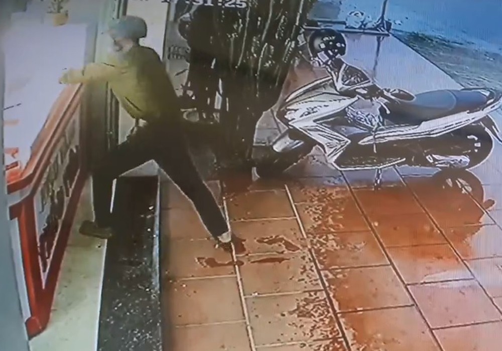 Khoảng 17h30 cùng ngày, bà V. ngồi trong nhà. Lúc này, em gái của bà đang ngồi gia công vàng bên trong tiệm. Bà giật mình khi nghe 2 tiếng búa đập vào tủ gương. Ngay lập tức, chị em bà V. chạy ra phía trước cửa tiệm.