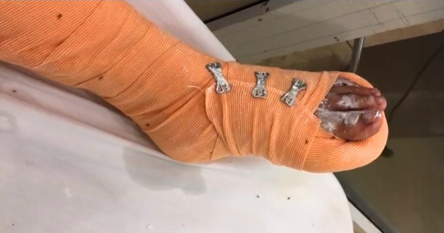Ngón chân của thiếu nữ bị bạn trai dùng cán dao đánh gãy phải bó bột.