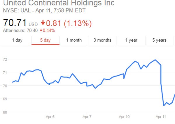 Cổ phiếu hãng hàng không United Airlines đêm qua có thời điểm rớt gần 5% khiến giá trị của hãng mất hơn 1 tỷ USD sau sự cố liên quan tới một khách hàng gốc Việt.