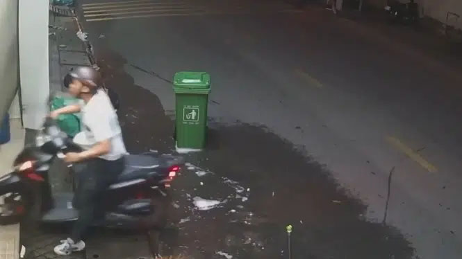 Lúc này, một số nhân viên của một cửa hàng đối diện thấy vậy liền chạy ra can ngăn. Người vợ núp sau một người mặc áo đen nhưng L. tiếp tục xông vào đánh.