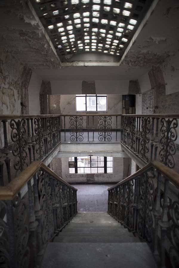 Hành lang tối om, sâu hun hút với những mảng tường đang bong tróc