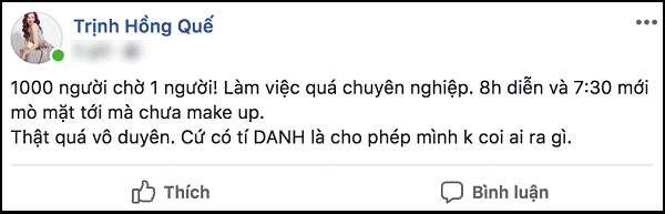 "1.000 người chờ 1 người! Làm việc quá chuyên nghiệp. 8h diễn và 7h30 mới mò mặt tới mà chưa make-up. Thật quá vô duyên. Cứ có tí danh là cho phép mình không coi ai ra gì", Hồng Quế bức xúc.