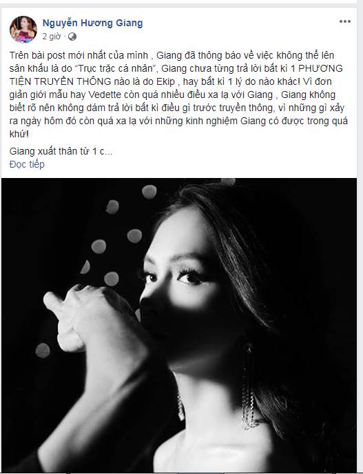 Vụ việc xảy ra, mỹ nhân chuyển giới khá bức xúc vì cô nghĩ sẽ có người trong BTC nhắc nhở việc tham gia trình diễn. Tuy nhiên, kế hoạch không theo mong muốn nên Hương Giang Idol lỡ hẹn với khán giả.