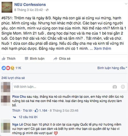 Kết quả là anh bỏ mình, khuyến mại thêm cái bào thai nhỏ. Mình khóc nhiều, suy sụp nhiều, chỉ biết cố đi học rồi xin đi dịch tích tiền chuẩn bị cho con. Mình giấu gia đình vì ở quê tai tiếng là điều kinh khủng. Mình bảo lưu học 1 năm. Mình sẽ tự nuôi con, bằng mồ hôi, máu và nước mắt.