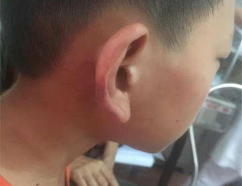 Mặt cháu T. thâm tím do bị mẹ kế tát.