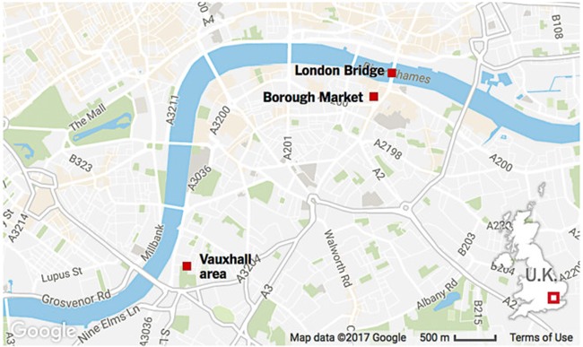 | Vị trí cầu London và chợ Borough. Đồ hoạ: New York Times. |