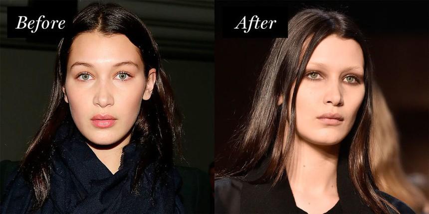 Nàng mẫu Bella Hadid đã phải nhuộm lông mày để phù hợp hơn với concept trình diễn thời trang. Trông cô nhợt nhạt và lạnh lùng gấp bội khi lông mày trắng ợt cùng lối đánh mắt nâu khói.