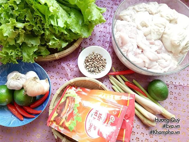 Bước 1: Dùng giấm hoặc chanh để khử mùi hôi của lòng non, khấu đuôi, lòng già, rửa nhiều lần nước tới khi lòng non, khấu đuôi sạch hết mùi hôi thì cắt miếng dài khoảng 3-5 cm.