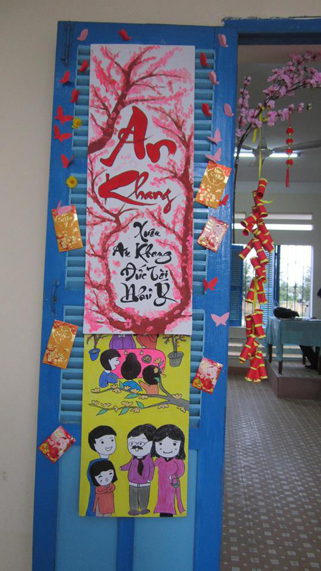 Với sự góp sức của cả tập thể, cộng thêm sự khéo tay hay làm và óc sáng tạo của người trẻ, rất nhiều lớp học trở nên lung linh và đẹp mắt khiến bất cứ ai bước vào cũng cảm thấy bồi hồi không khí xuân, điển hình như lớp học dưới đây.