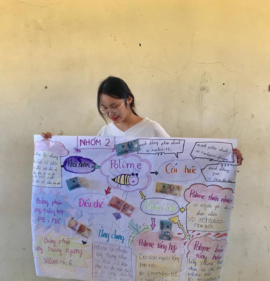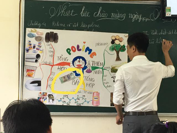 Chính sự hay ho và lanh lẹ trong việc vận dụng hết năng lực khi hoàn thành bài vở mà mới đây, một lớp học bất ngờ gây chú ý với phần trình bày minh họa trước cho phần thuyết trình nhóm. Cụ thể, trong một tiết hóa bài về polime và vật liệu polime, bên cạnh việc trang trí tờ giấy A3 bằng những bức vẽ với màu sắc sinh động, các bạn học sinh còn tạo điểm nhấn cực "độc đắc" và chân thực bằng tờ 500 nghìn đồng.