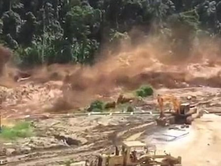 Dòng nước lũ bất ngờ kéo đến với sức mạnh khủng khiếp khiến hàng loạt công nhân đang có mặt tại hiện trường hoảng loạn tìm đường chạy thoát.