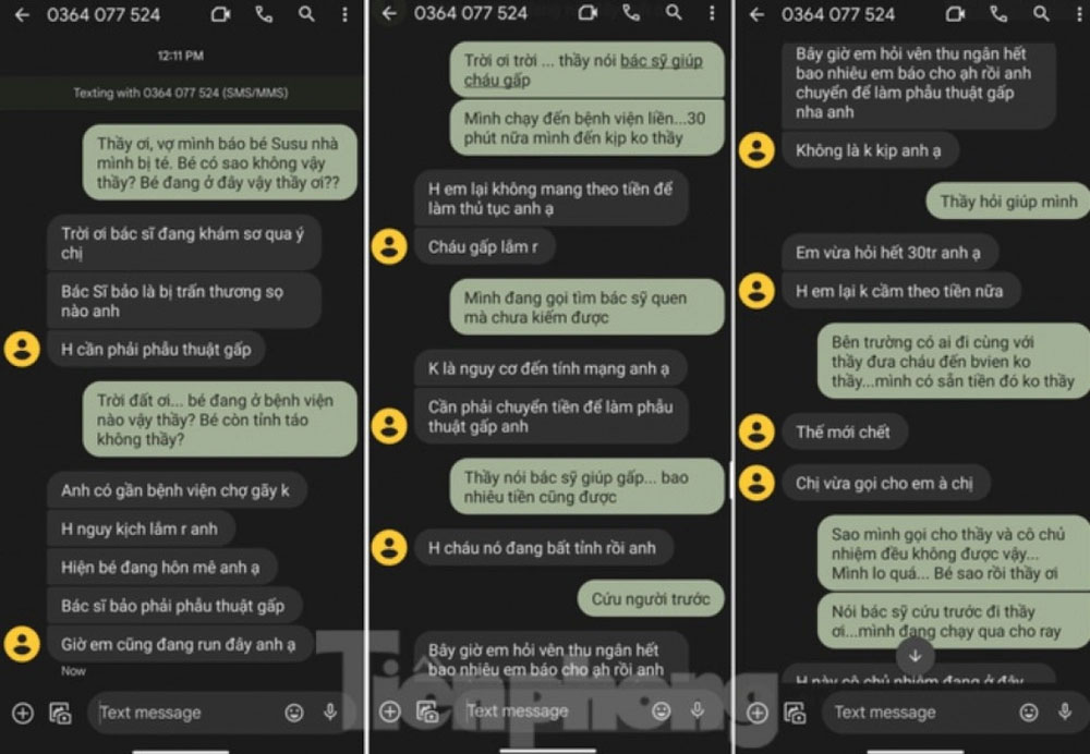 Tin nhắn của người tự xưng giáo viên nhắn lừa phụ huynh chuyển tiền khi con đang cấp cứu. Ảnh: Tiền phong