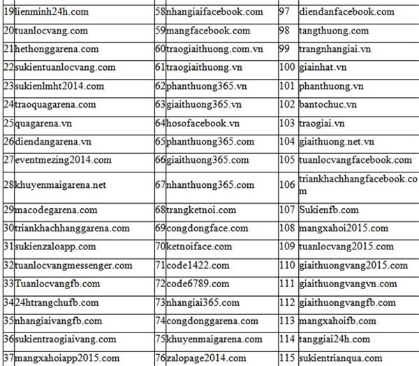 Dưới đây là danh sách 117 website giả mạo mà các đối tượng này đã lập ra từ đầu năm 2014 đến nay: