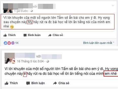 T.H đã chỉnh sửa lại những dòng trạng thái viết về Huyền My trên mạng xã hội. Theo đó, tất cả chữ "My" được sửa lại thành "em"